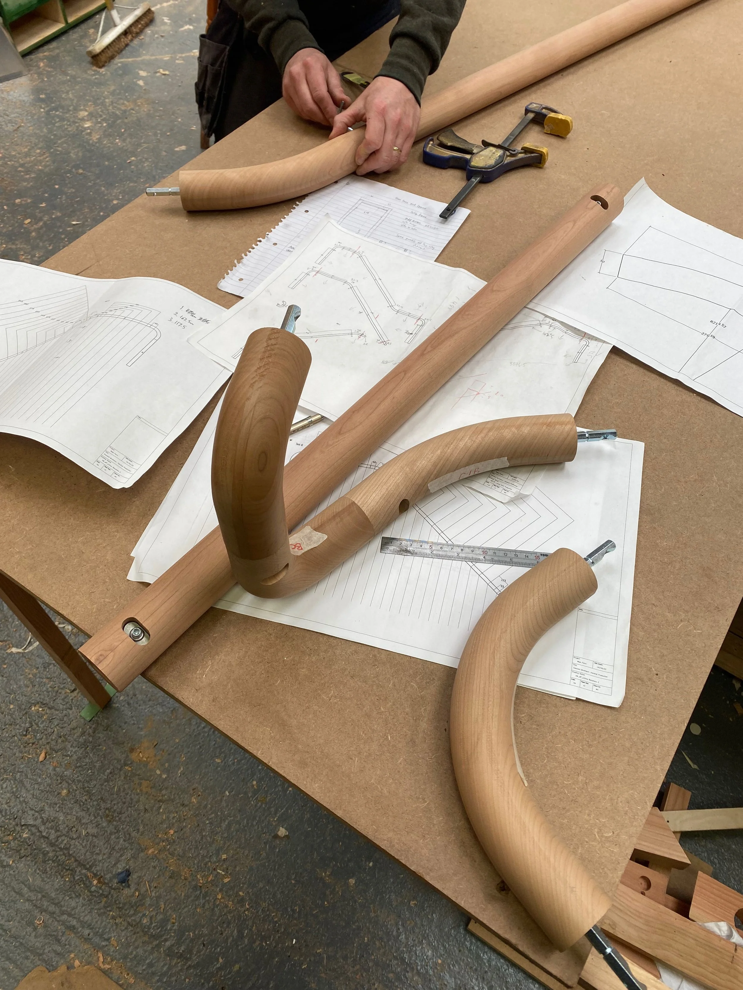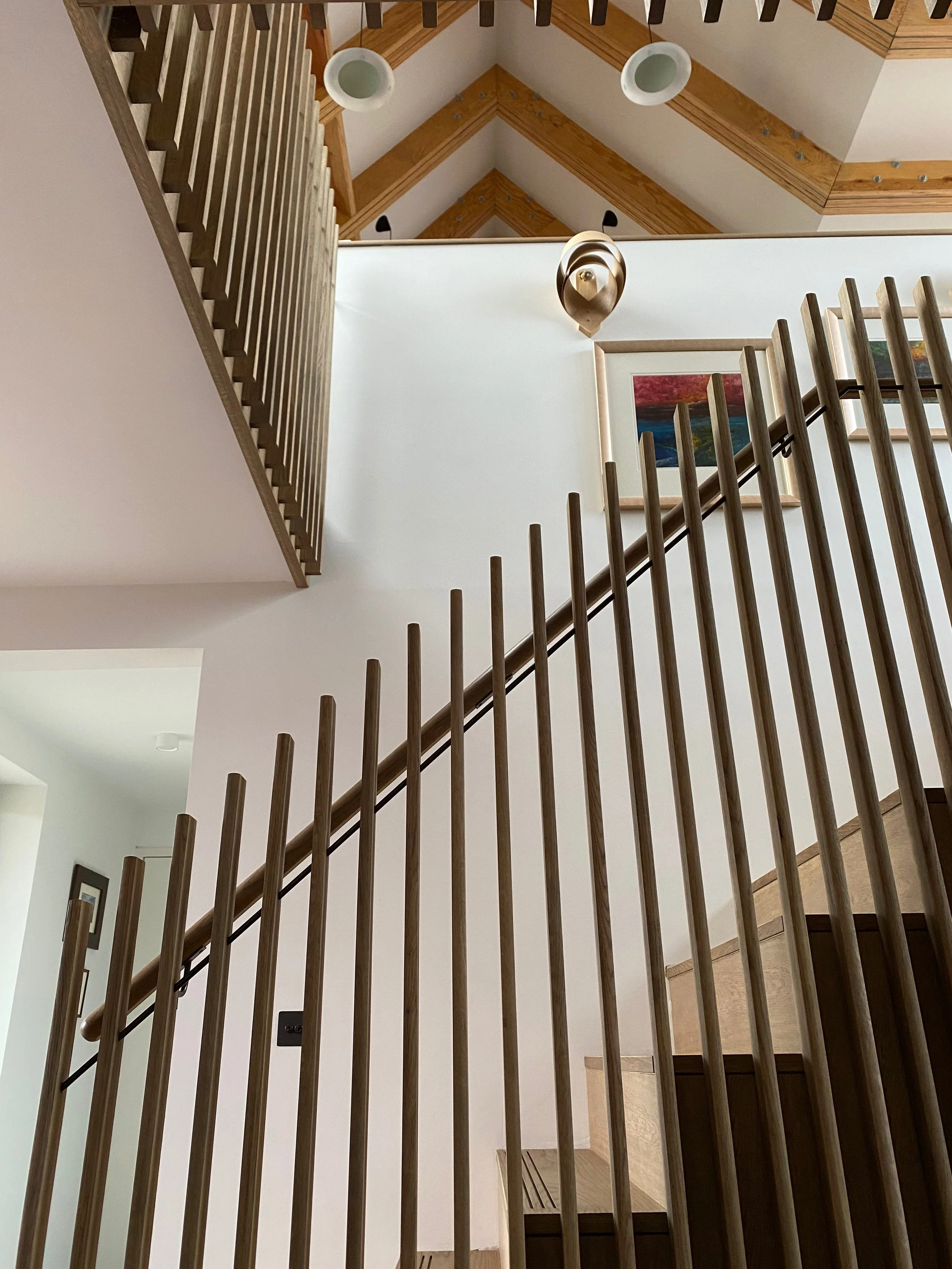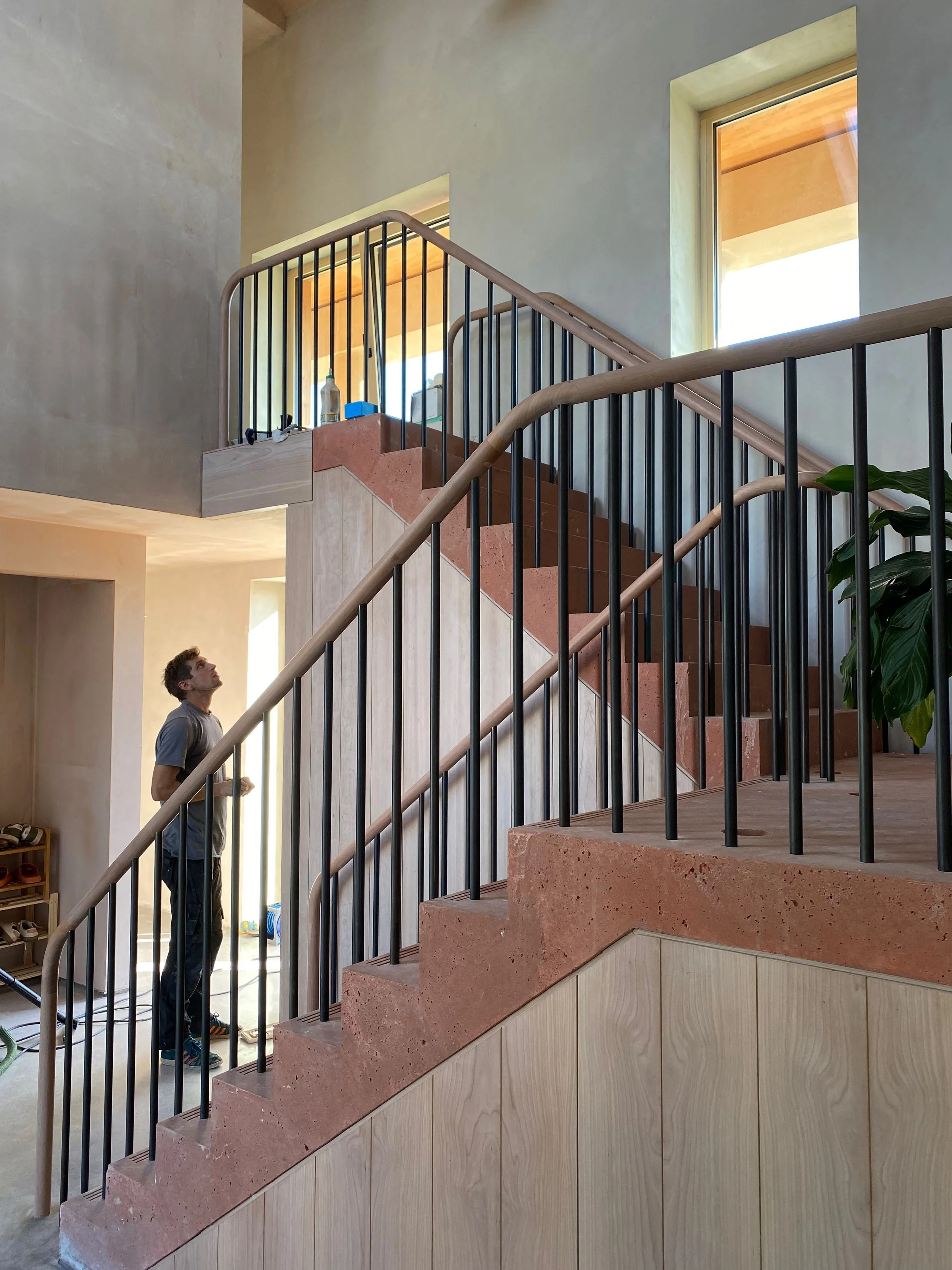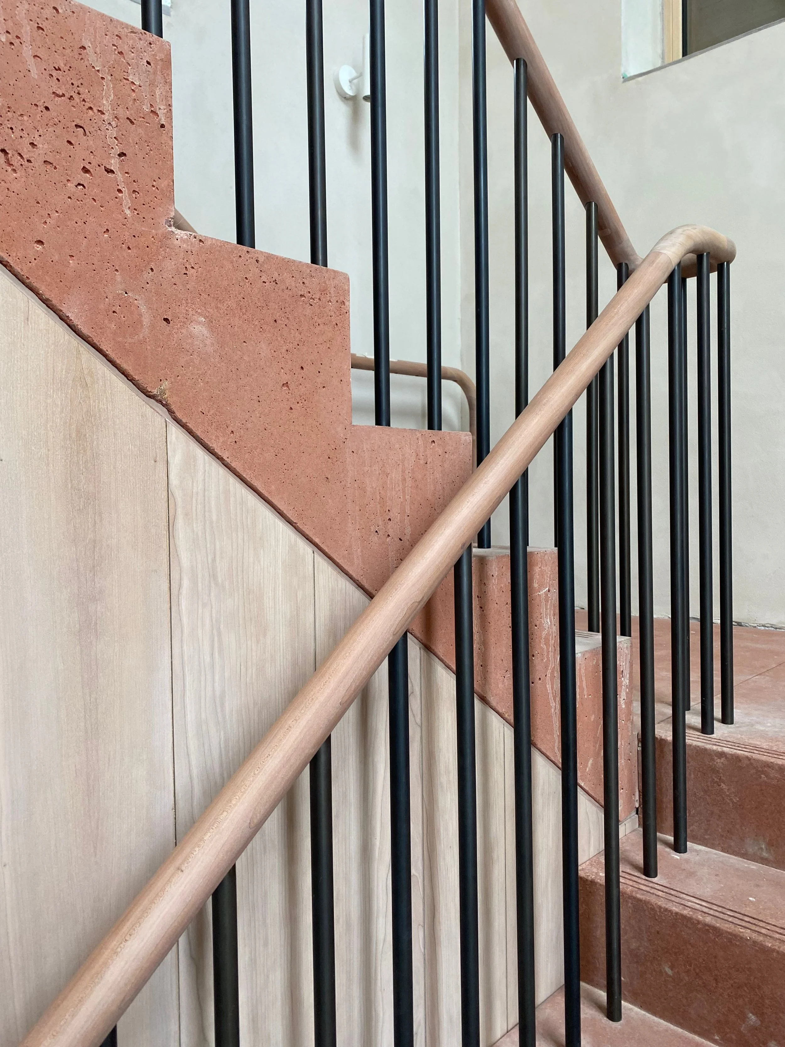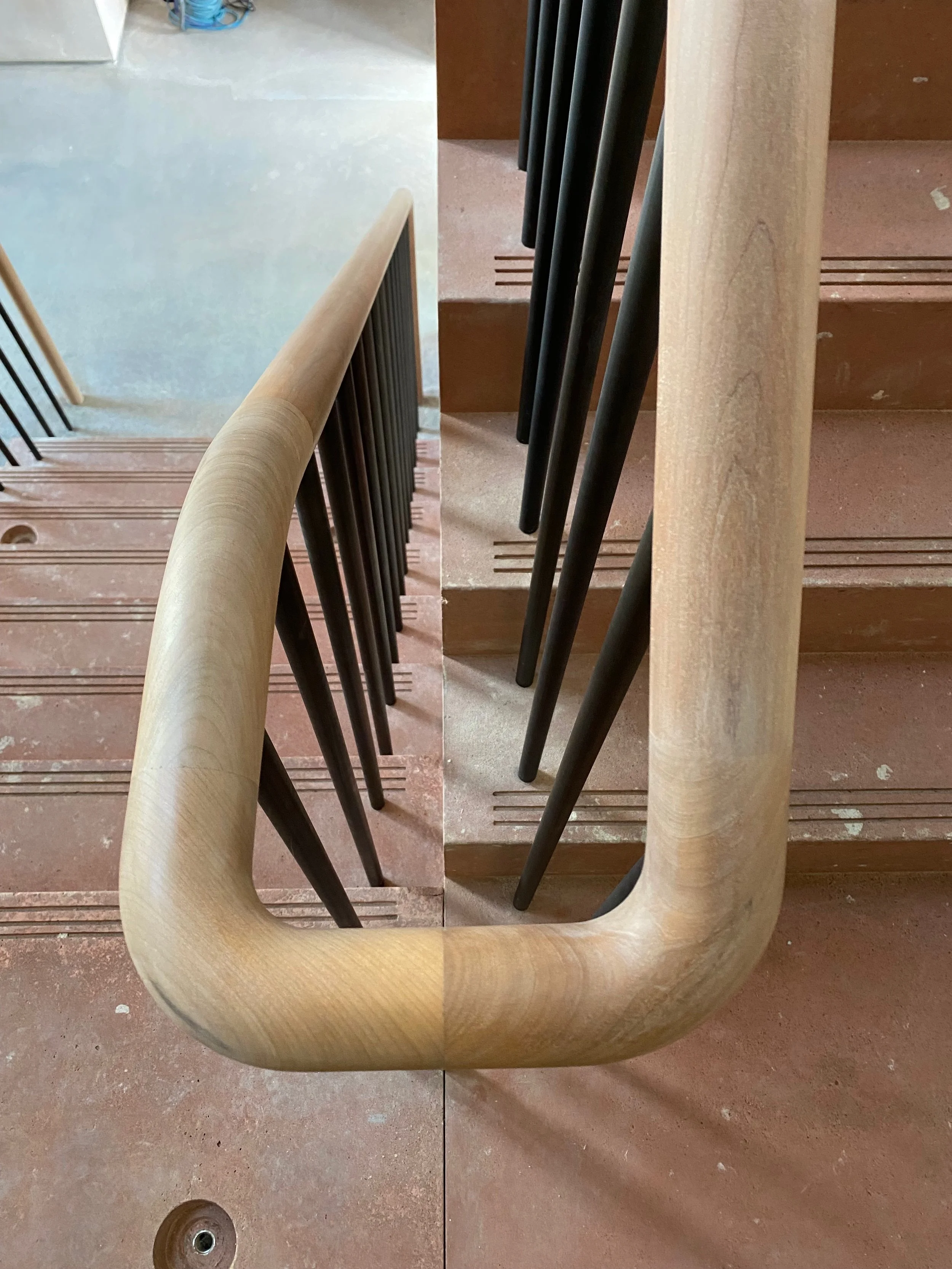 Turned balustrade in American Cherry with steel spindles, Cherry veneer panelling, 2023.