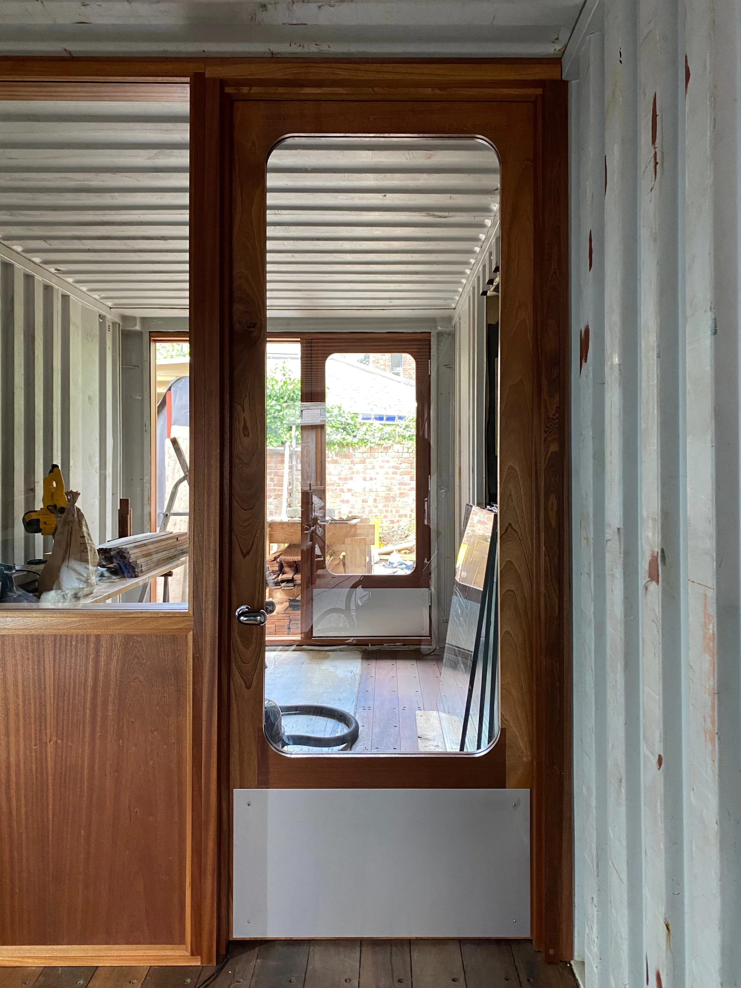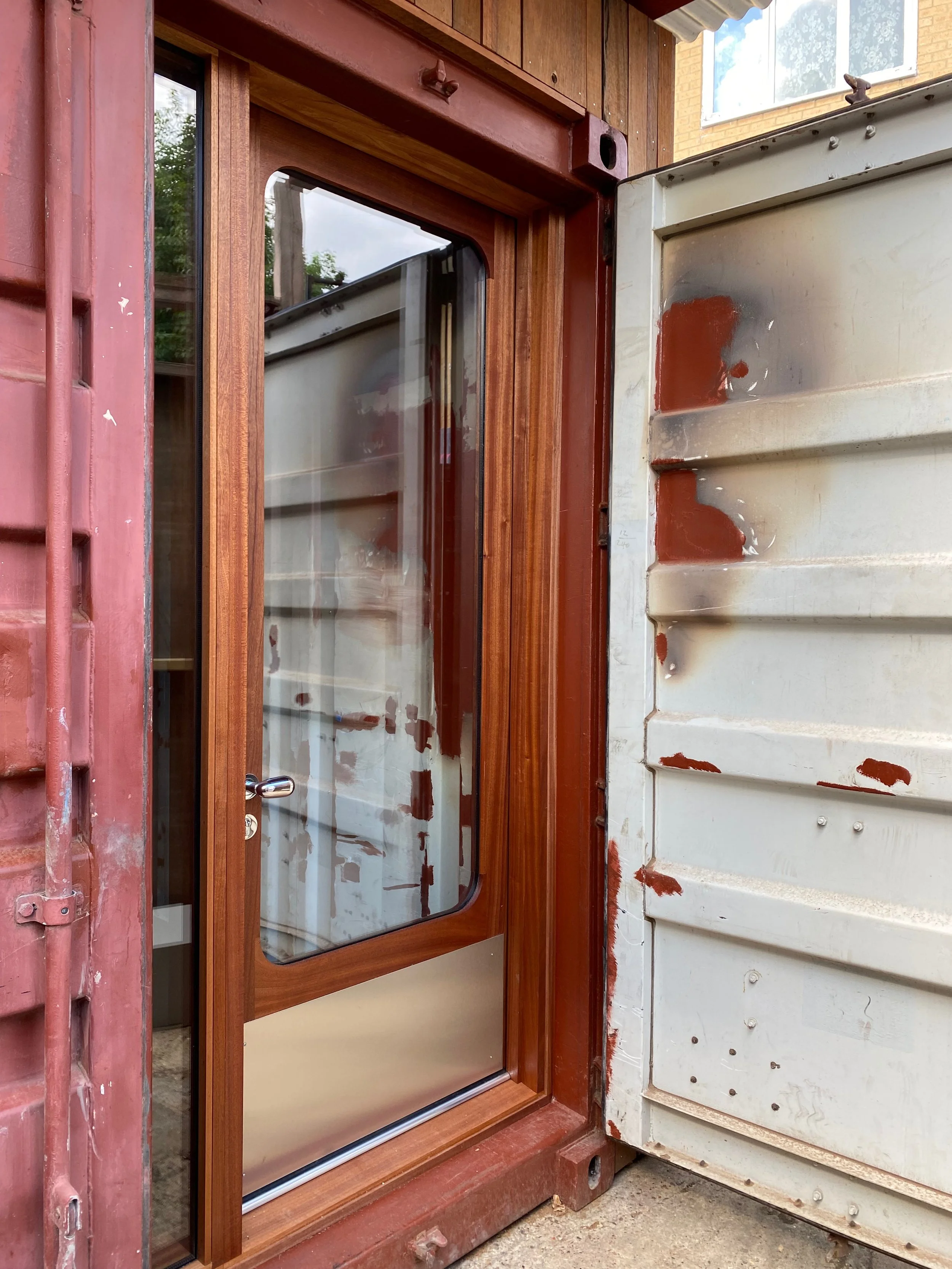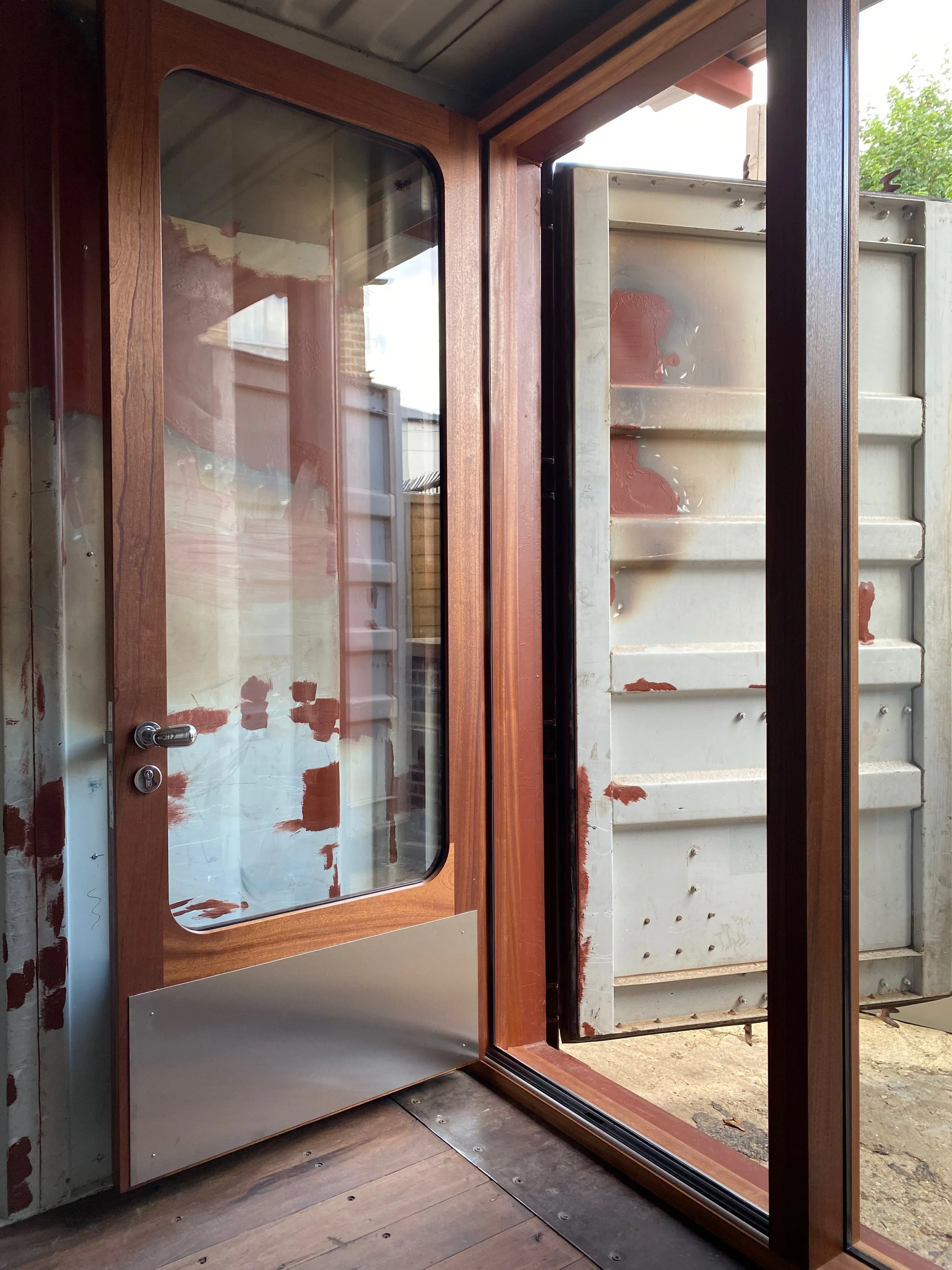 Three glazed doors with adjacent fixed panes for a container office in Hackney. Made in Sapele with a radius on the internal corners and some excellent uovo handles. Design from PUP architects