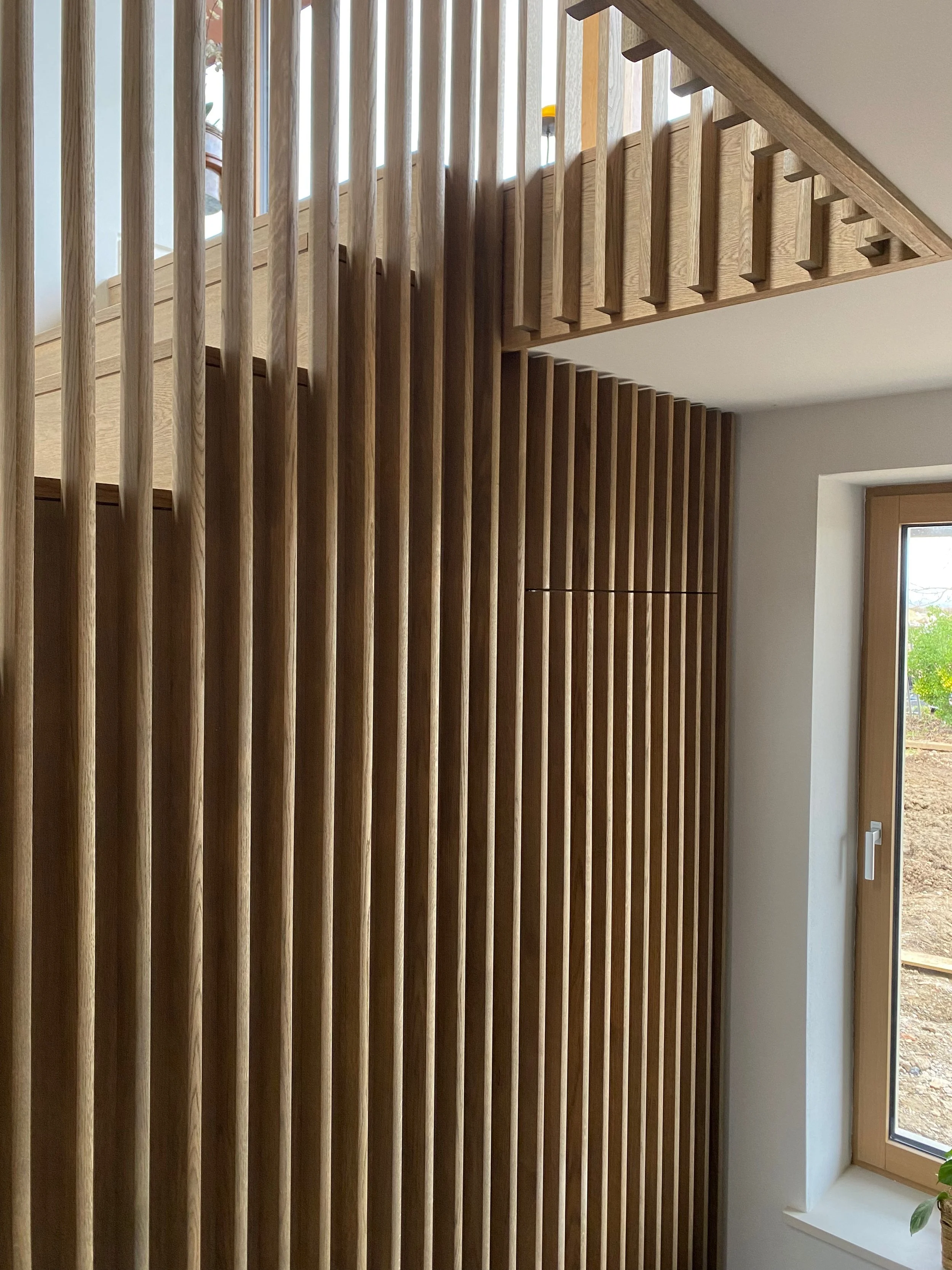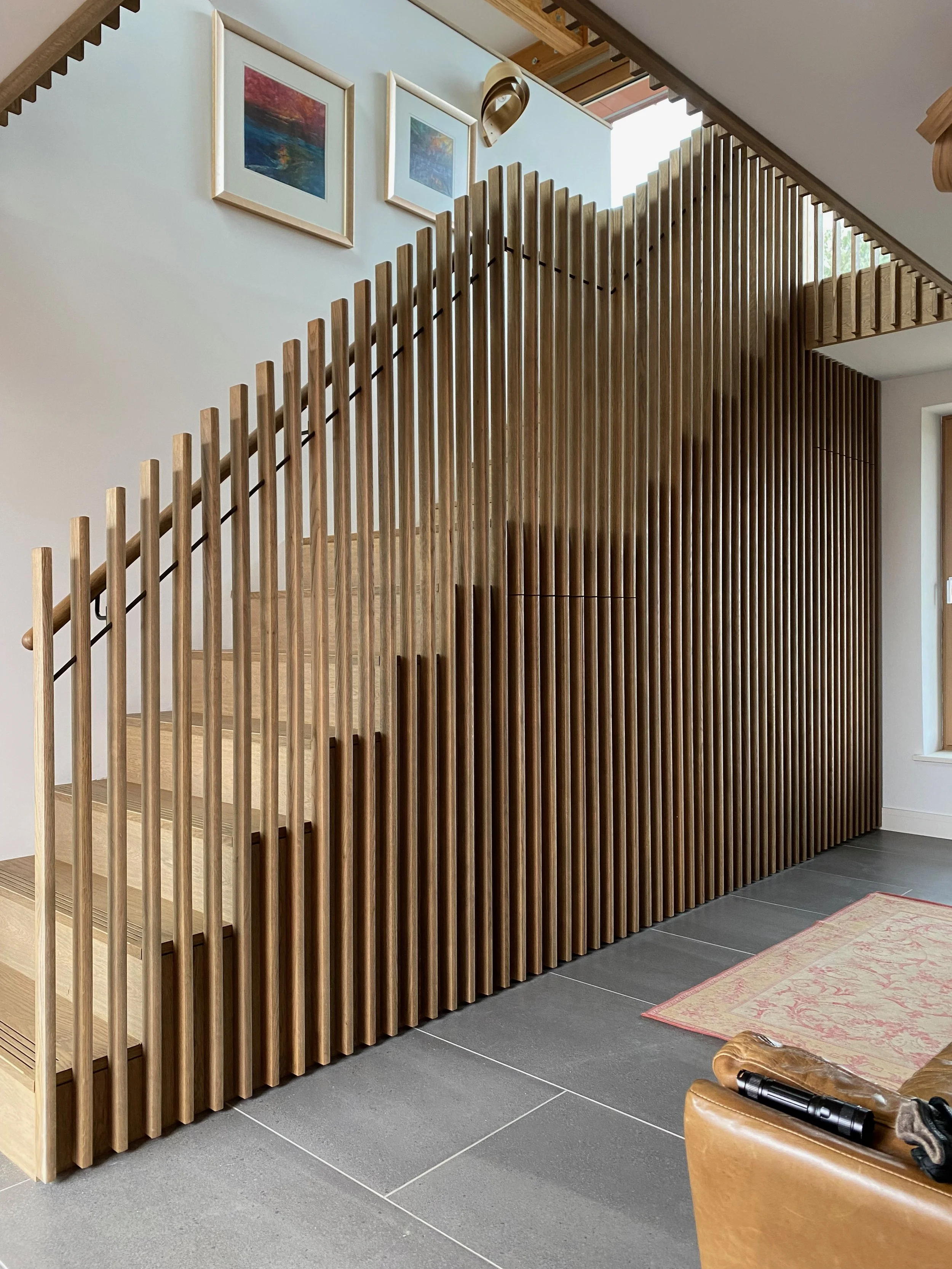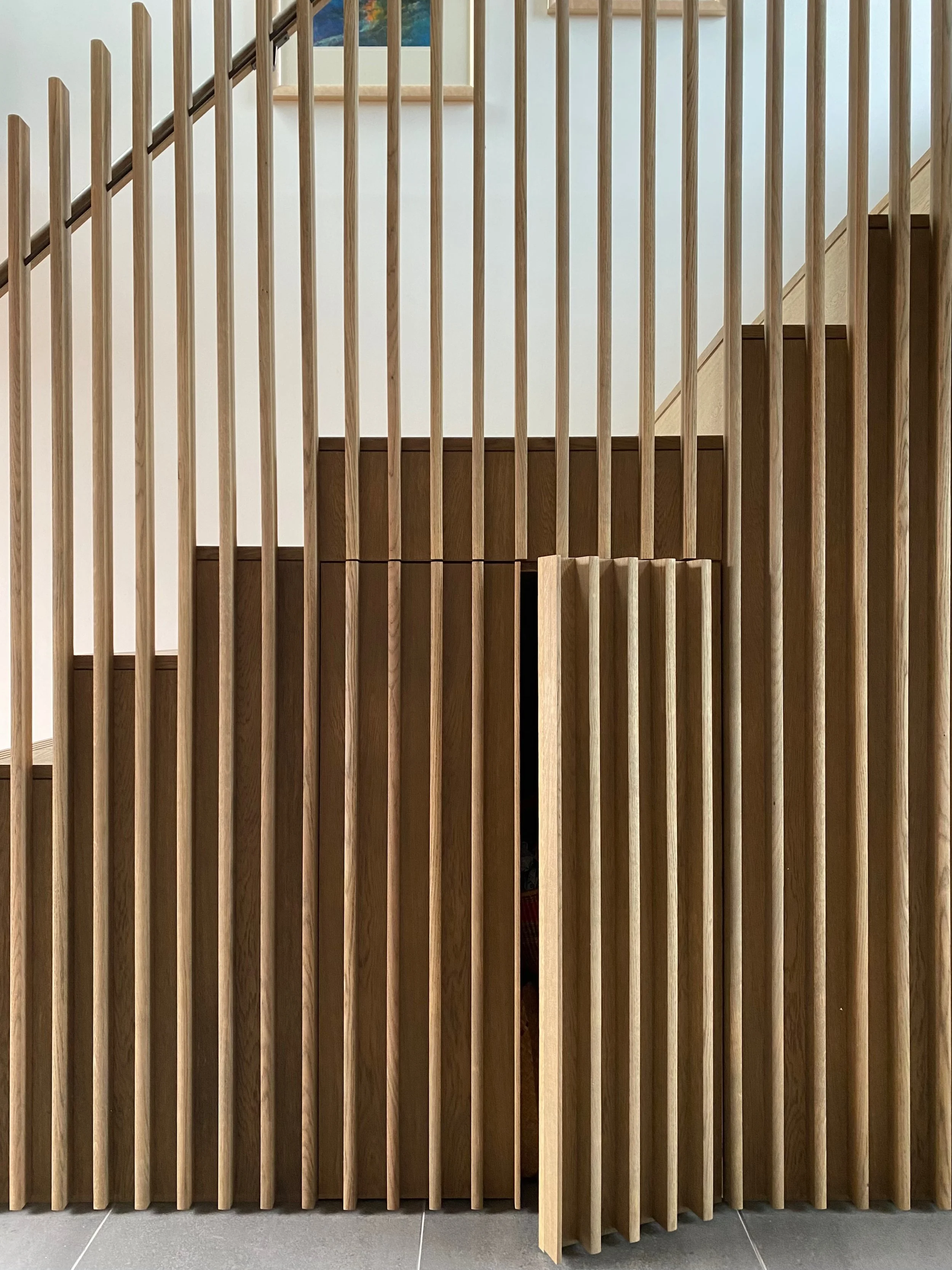 Oak staircase and balustrade with concealed doors, 2023. Design from Charles Gillespie Architecture